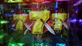 8連目は70回転、「7」テンパイ+伊達+朱槍ギミック+「天撃ボタン」→「7」10R当たり。
