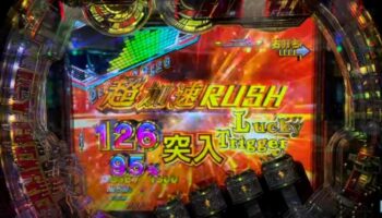 また、加速RUSH中の4.5%の10Rあたりで、上位のラッキートリガーである超加速RUSHに突入します。継続率は破格の約95%で、大当たり確率は加速RUSHと同じ1/43.9ですが、ST回数が126回に増えます。