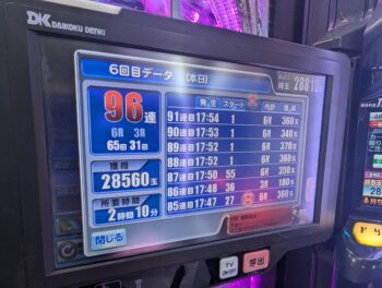 91連目は上乗せ演出から1回転、6R当たり。92連目は1回転、6R当たり。93連目は1回転、6R当たり。
