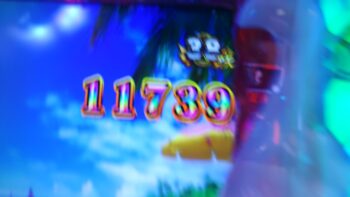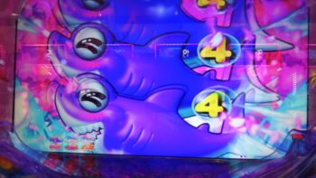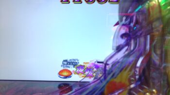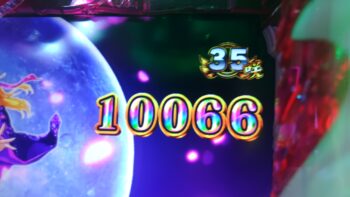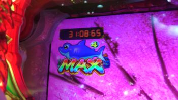 35連目は2回転「サメ」10R「MAX」当たり。ここで出玉が10000発を超えました。保留連の金魚群も出ました。