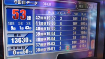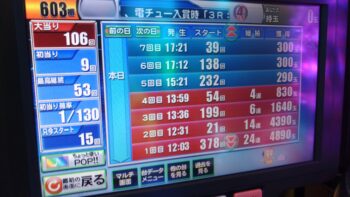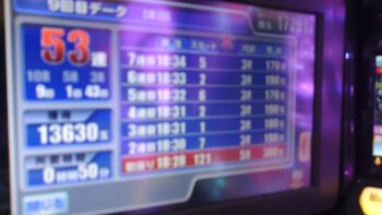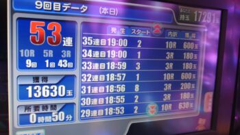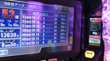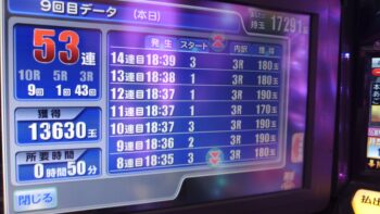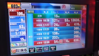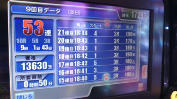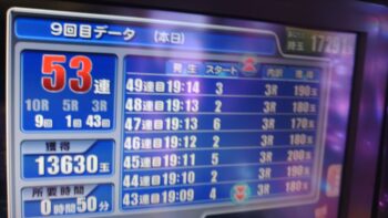 その次の台が、前々日から41回、前日60回で、本日の初当たりは、1回目が378回転で24連、2回目が21回転で14連、3回目が199回転で6連、4回目が54回転で3連、5回目が232回転で通常当たりもしくはRUSHスルー、6回目が138回転で通常当たりもしくはRUSHスルー、7回目が39回転で通常当たりもしくはRUSHスルー、8回目が24回転で2連してちょうど100回転で空いていました。