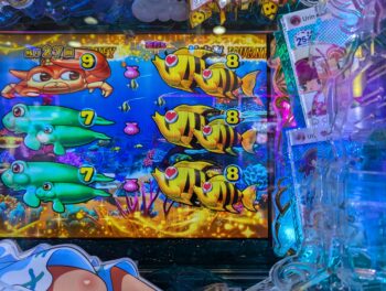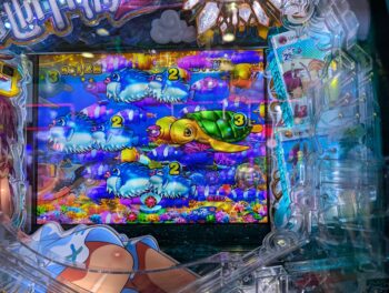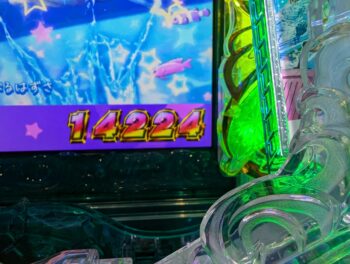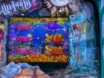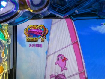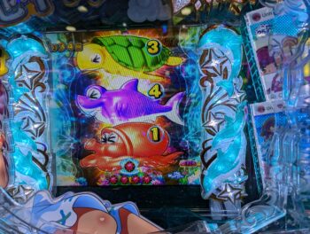 投資2Kの141回転で、先告知「ロゴランプ点滅」+右タテ「サメ」+魚群+サンゴ礁リーチ→「サメ」4R当たり。「チャンスタイム」には入りました。