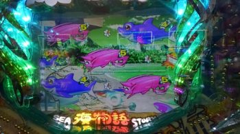 5連目は時短中の88回転で、右タテ「サメ」魚群+シロッコリーチ→「サメ」4R当たり。
