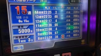 16連後の時短中の前半で閉店となりました。「地中海チャンス」はスルーする感じが全くなく、打ちっ放しで簡単に当たる感じしかありませんでした。