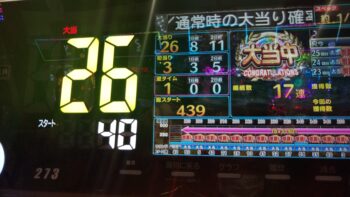 12連目は26回転、 「金」保留→「7」PREMIUM BONUS 10R 確変 当たりしました。