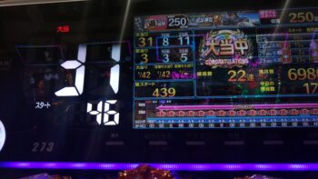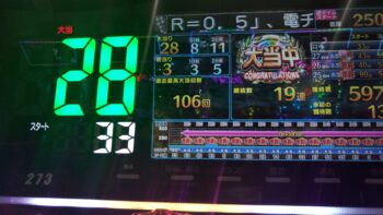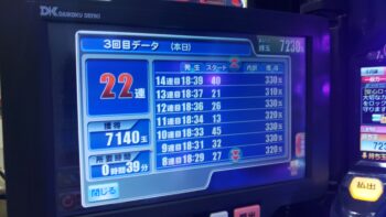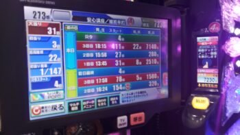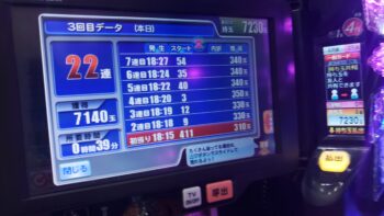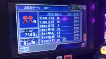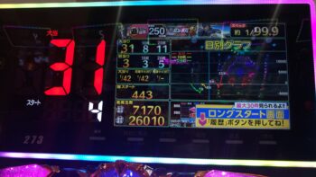 1台空いていたのが、前々日より、11回、前日8回当たり(筆者の履歴)の台で、本日の初当たり1回が、31回転で8連。2回目が27回転で、単発スルーして、112回転の台でした。
