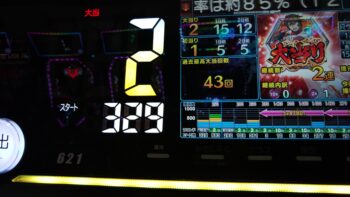 2連目は329回転、「7」 「超波動BONUS PREMIUM」 10R確変当たりしてくれました。それでも、329回転なら通常時以内の確率です。一度どれくらいハマるのか見てみたいのです。