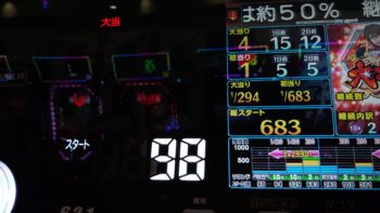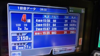 4連目は、98回転で「6」2R確変当たりでした。ST中に大当たりが遅く、2Rしか引けない台は、先が見えています。だいたいほかの台でも、10Rより、割合の少ない2R当たりする台とかは、次の当たりに期待できません。