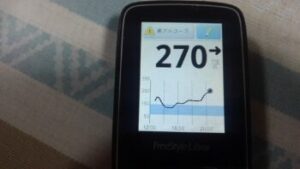 ・夕朝食前血糖値は高く、270mg/dlでした。(昼食時に血糖が低かったので、インスリン注射量を減らし過ぎました。)